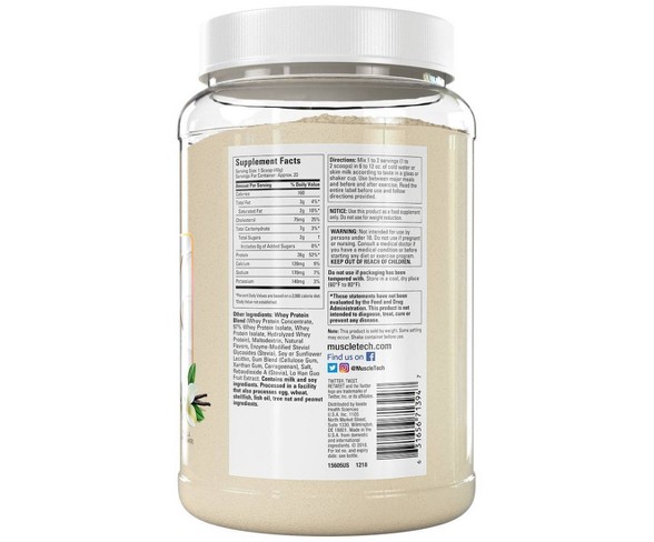 MuscleTech Nitro Tech Review - Is It The Best Whey? Nitro Tech is a whey protein powder that comes in a variety of flavors. Its high creatine, glutamine, and BCAA profiles are appealing. Besides, it contains more protein than similar supplements. One scoop of Nitro-Tech offers roughly: 160 calories. 30g of protein. 4g of carbs, including 2 grams of sugar. Muscletech Pure Series 100% Whey Protein Shake - Target MuscleTech Pure Series 100% Whey Protein is premium protein the way it's intended - pure, clean, and free of artificial flavors, colors and sweeteners. Whether you're looking to support your fitness goals, recover from your workouts, or simply add more protein to your diet, this is the product for you.
