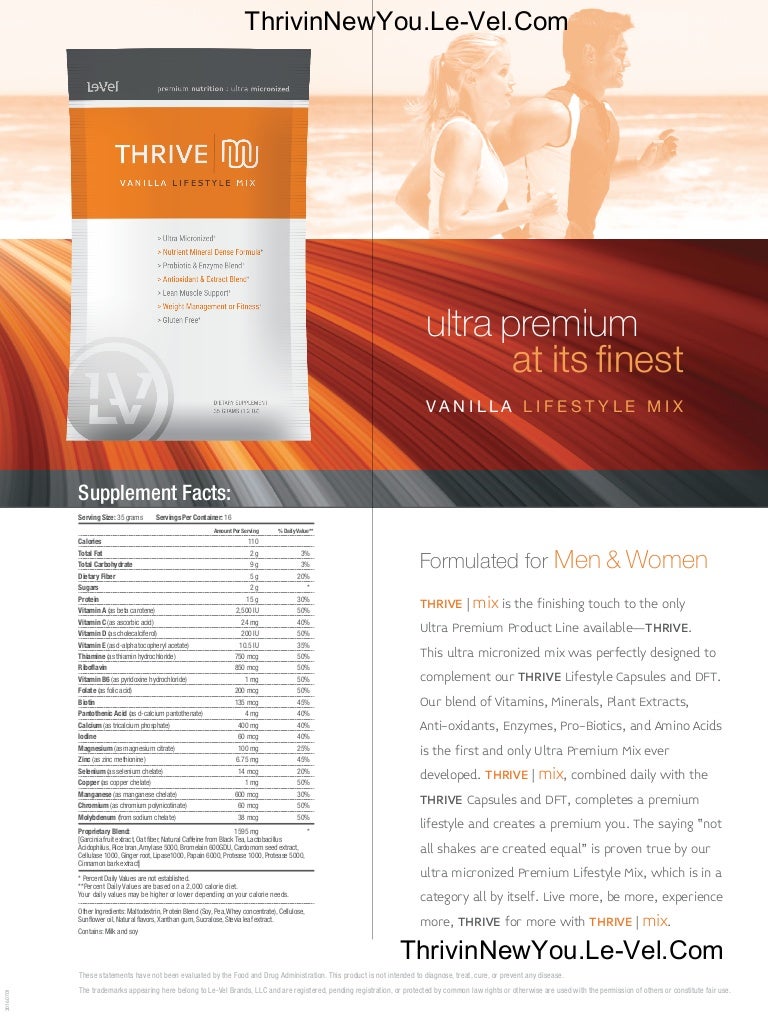 PDF PRODUCT INFORMATION - Le-Vel Brands LLC THRIVE MIX is the finishing touch to the only Ultra Premium Product Line available-THRIVE. This ultra micronized mix was perfectly designed to complement our THRIVE Lifestyle Capsules and DFT. Our blend of Vitamins, Minerals, Plant Extracts, Anti-oxidants, Enzymes, Pro-Biotics, and Amino Acids is the first and only Ultra Premium Mix ever