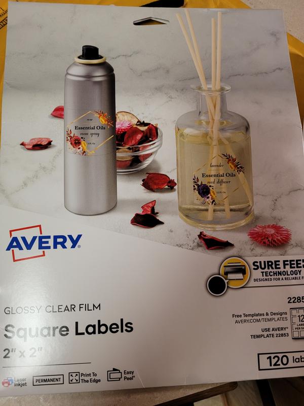 Avery AVE22853: Sure Feed Glossy Labels - 2" Width x 2" Length ... Avery AVE22853 [ AVE22853 ]: Sure Feed Glossy Labels - 2 Width x 2 Length - Permanent Adhesive - Square - Laser, Inkjet - Crystal Clear - Film - 12 / Sheet - 10 Total Sheets - 120 Total Label(s) - 120 / Pack. These customizable, Glossy Clear Square Labels will give your products a professional, printed-on look that is sure to stand out.