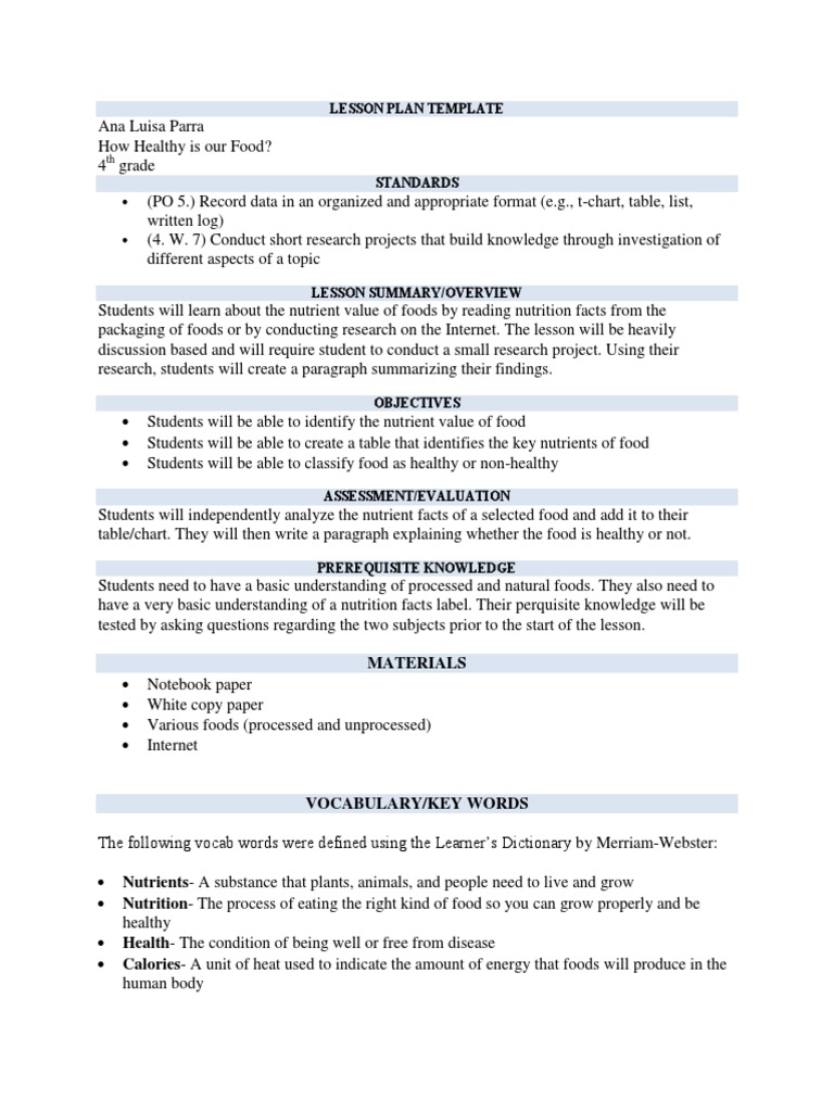Nutrition Lesson Plan for Elementary School Kids - Health Beet Other nutrition lesson plan activities: The above outline is all we have time for, but I do plan to replace some of the activities in future nutrition presentations with some of these ideas: Healthy food coloring pages. Reading a food label. Red, yellow, and green light foods; Gardening activity- where does food come from?