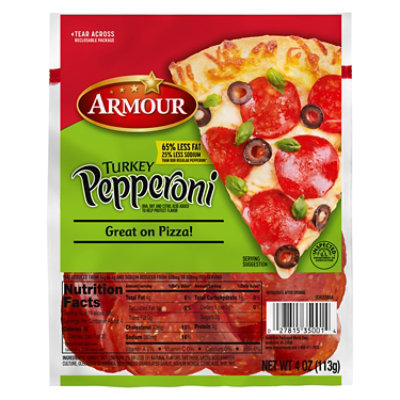 Hormel Pepperoni Turkey - 5 Oz - Shaw's Regular Pepperoni = 140 calories; 13 g dat per serving; Turkey Pepperoni = 70 calories; 4 g fat. Gluten free. 70% less fat than our regular pepperoni. Since 1891. America's no. 1 pepperoni brand (Based on latest 52-week IRI data). Smoke flavoring added. BHA, BHT, with citric acid added to help protect flavor. Packet enclosed to keep product fresh.