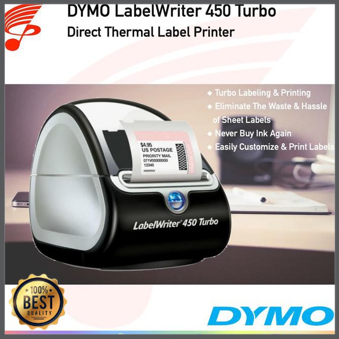DYMO LabelWriter 450 Twin Turbo Direct Thermal Label Printer ... The DYMO LabelWriter® 450 Twin Turbo features two rolls of labels ready to print at all time–enhancing efficiency by allowing you to print address labels and postage without swapping label rolls–and prints up to 71 four-line standard address labels per minute for maximum productivity.