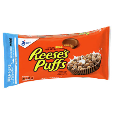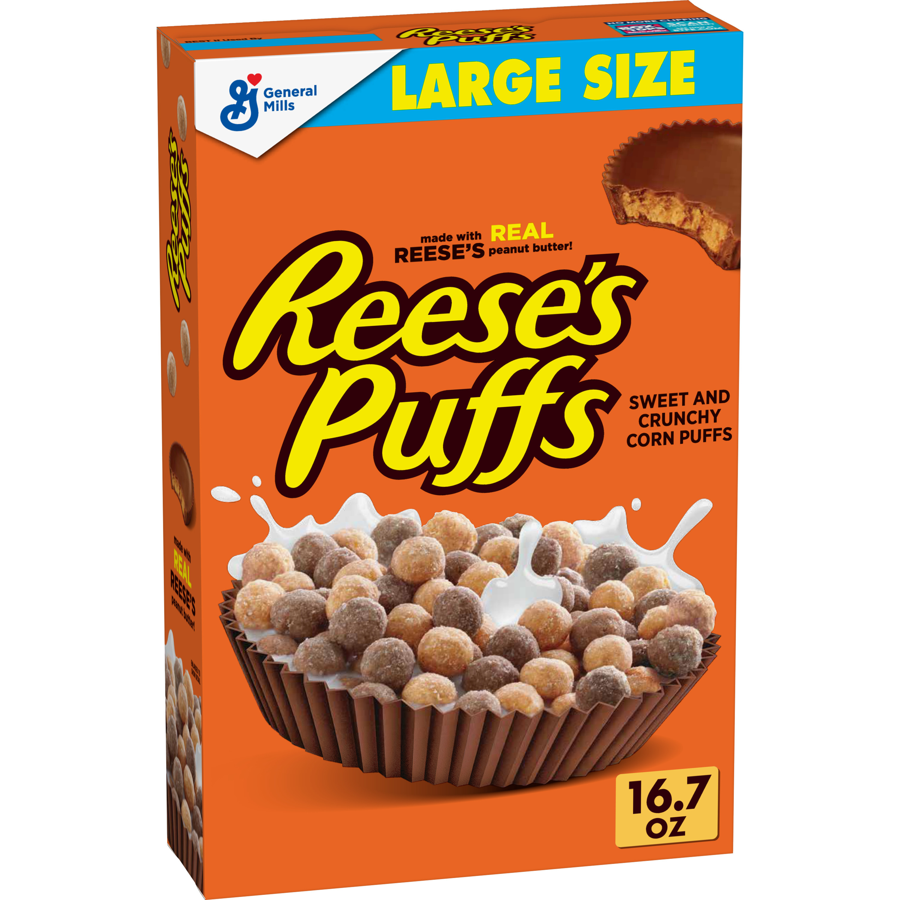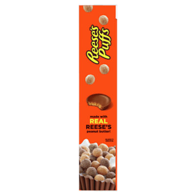 Reese's Puffs | Peanut Butter Cereal | General Mills Cereal Whole Grain Corn, Sugar, Reese's Peanut Butter (peanuts, sugar, monoglycerides, peanut oil, salt, molasses, corn starch), Dextrose, Corn Meal, Corn Syrup, Canola Oil, Salt, Hershey's Cocoa, Caramel Color, Trisodium Phosphate, Natural Flavor. Vitamin E (mixed tocopherols) Added to Preserve Freshness. Contains PEANUT INGREDIENTS Vitamins & Minerals