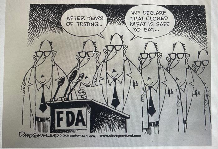 FDA Approves Cloned Meat for Consumption - ABC News The FDA also doesn't plan to require the labels for cloned animal products. Critics worry the cloned and genetically modified foods still may be unsafe for consumption. "It is really a huge, uncontrolled experiment on the American people," said Andrew Kimbrell of the Center for Food Safety.